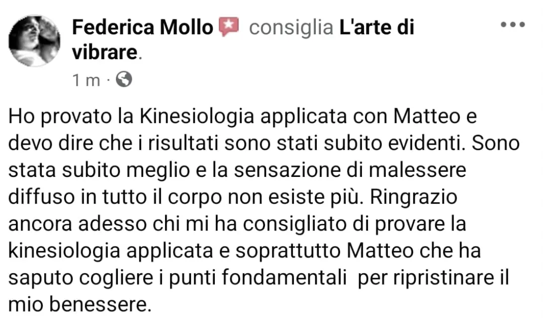 La Kinesiologia applicata offre un’esperienza completa e personalizzata per il tuo benessere. Durante l'incontro individuiamo squilibri nel corpo e fonti di stress. Questo metodo non invasivo aiuta a ristabilire l'equilibrio energetico e fisico, migliorando la tua salute generale. Ogni seduta fornisce un quadro chiaro del tuo stato psico-fisico e propone un percorso personalizzato per il benessere a lungo termine, affrontando problemi come ansia, stress, dolori muscolari, disfunzioni digestive e allergie.